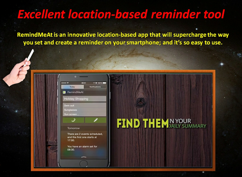 A LOCATION BASED APP THAT SUPERCHARGES THE WAY YOU SET REMINDERS Visit www.RemindMeAt.com for more info.